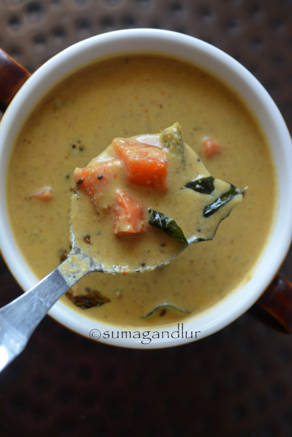 * Heat oil in a pan and add mustard seeds, and cumin seeds. When mustard seeds start to splutter, add curry leaves, turmeric, asafoetida and stir. Immediately add the cooked vegetables along with water used to cook them, the peanut paste, salt, tamarind and sweetener if using. Add water to reach the desired consistency like a sambhar / stew. Taste and adjust the seasonings if needed. Simmer the sambhar for 7 to 8 minutes and serve hot with rice.